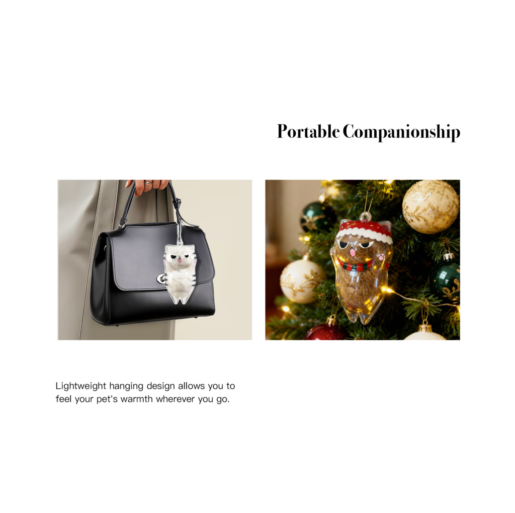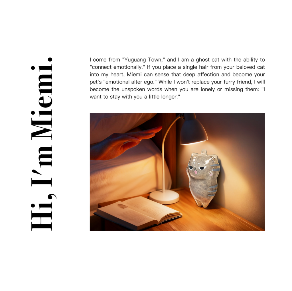We’ve specially given it the IP character “Miemi.” Miemi comes from “Yu Guang Town” and is a ghost cat with the ability to “connect emotionally.” If you place a strand of your cat’s fur into its heart, Miemi can sense this deep affection and become your pet’s “emotional alter ego.” It won’t replace your furry friend, but it will become the unspoken words when you’re lonely or missing them: “I want to stay with you a little longer.” Design Intent: Not a cold, impersonal ornament, but a keepsake that can hold your memories and prolong your companionship. It’s both a design and an emotional vessel; it can protect memories and become a warm gift.